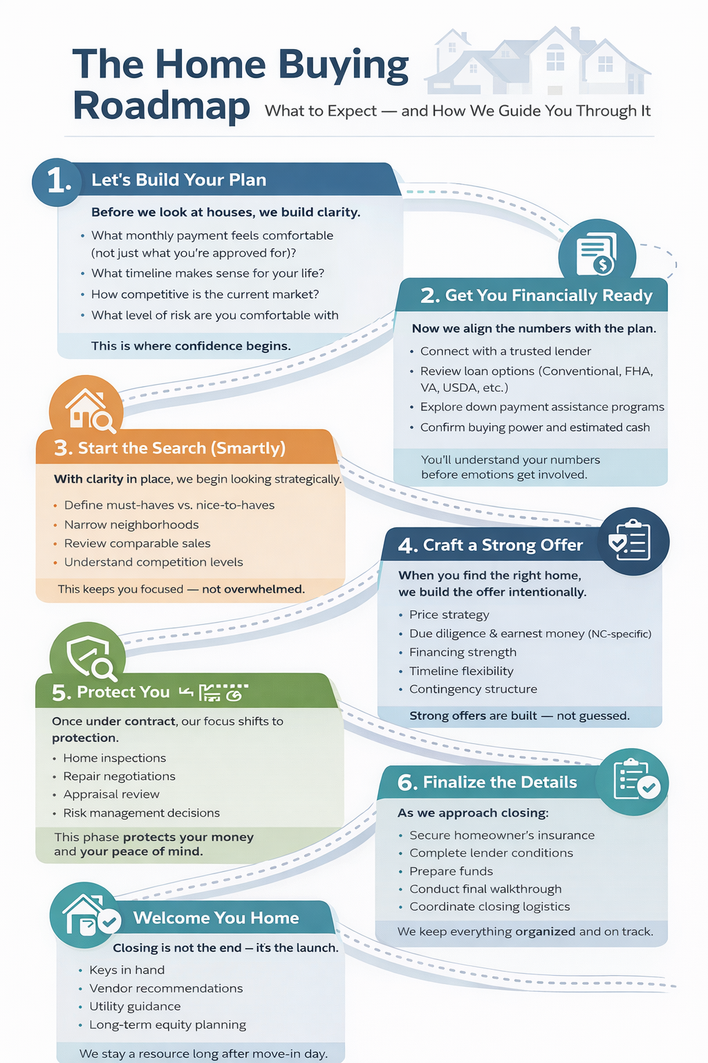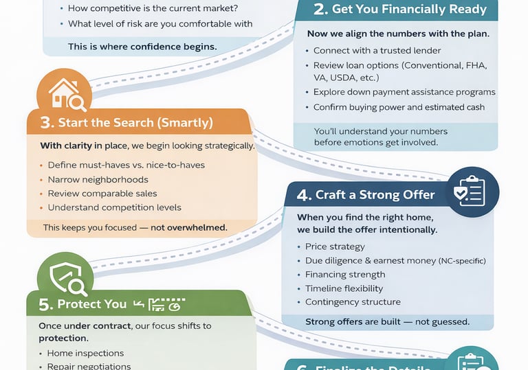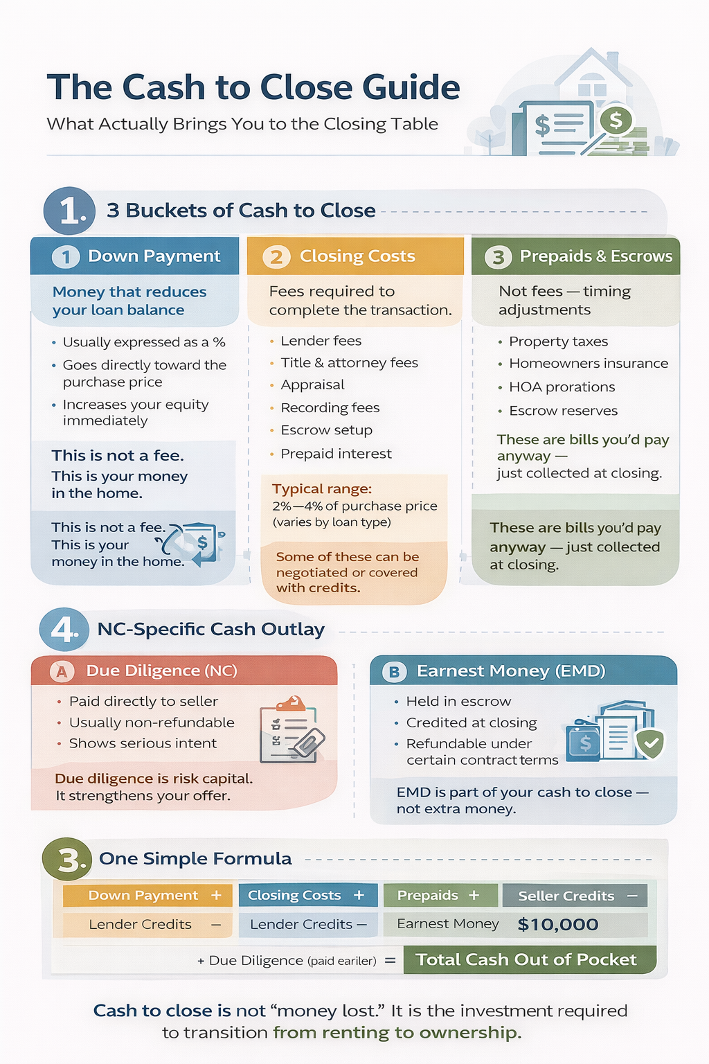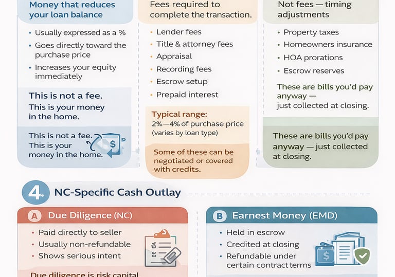 A simple breakdown of down payment, closing costs, prepaids, and credits—so you understand exactly what brings you to the closing table in North Carolina.